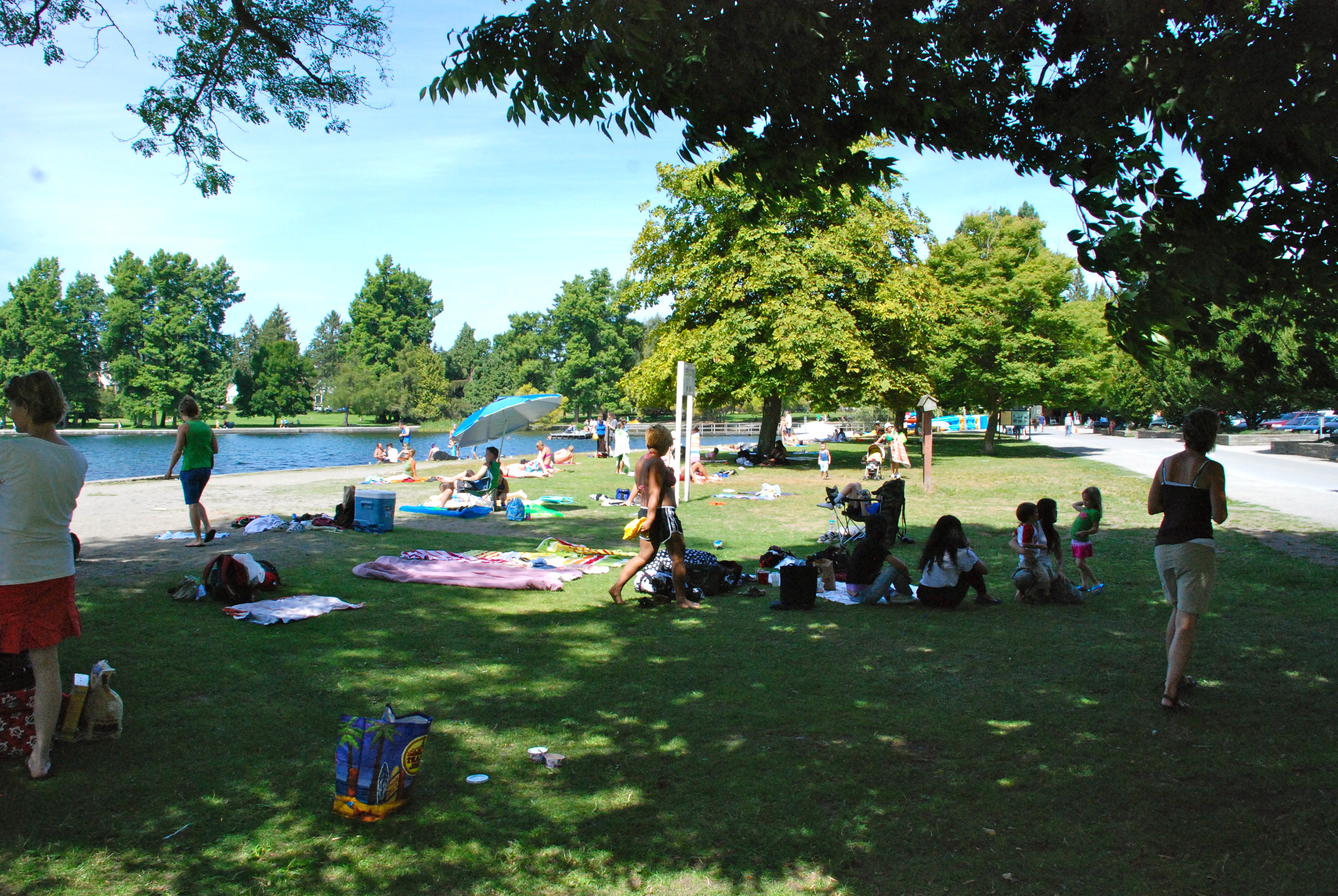 Durant l’estiu habiliten una zona per banyar-s’hi a la vora del llac i no cal dir que hi ha totes les mesures de seguretat possibles i impossibles. A uns 20 metres de la vorera hi ha una plataforma amb un trampolí. Els vigilants de la platgeta no paren de donar indicacions als nedadors.