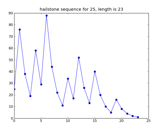 Amb l’ajuda d’una calculadora, calcula la trajectòria de totes les llavors inicials entre l’1 i el 10 (inclosos). A continuació, elabora un gràfic on es vegi, per a cada llavor inicial, la seva trajectòria, de forma similar al que veus a la imatge de la dreta, que mostra la trajectòria de la llavor inicial 25. Com pots observar, el temps total de finalització d’aquesta llavor és 23.