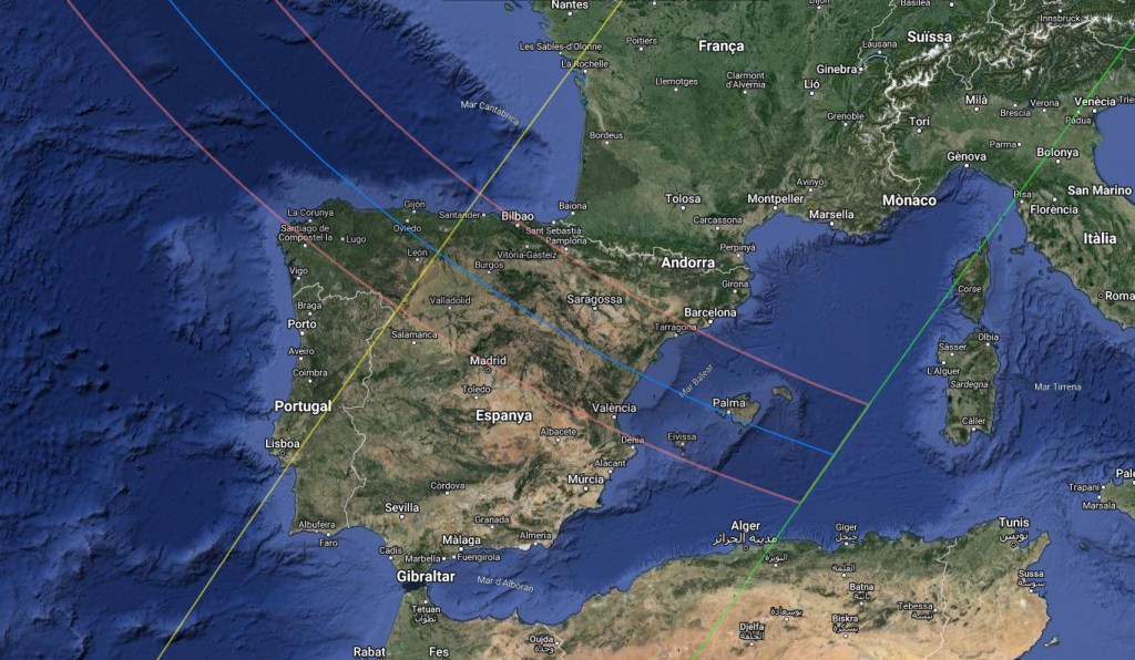 A Islàndia, el començament de l’eclipsi total serà a les 17.48. A Castelló de la Plana i a Palma serà pels volts de les 20.31, amb pocs segons de diferència, i durarà un minut i mig, aproximadament. Segons que s’observa en el mapa, la trajectòria limitarà amb Sitges, al nord, i Cullera, al sud. “Barcelona és una gran ciutat que és a pocs quilòmetres del final de l’eclipsi. Segur que hi haurà un xou a la sortida de la tarda, perquè la gent el voldrà veure”, comenta Enric Marco, tècnic superior d’astronomia i astrofísica de la Universitat de València i doctor en física solar.