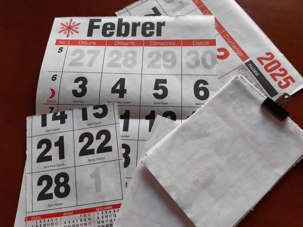 Hem esgotat tots els dies del febrer els negres i els vermell i toca arrencar la pàgina. Fa temps que no tenia un calendari que calgués desprendre les pàgines, normalment passaves els fulls. Això m’ha retornat a la infància quan els mesos estaven tots junts units a una sola imatge que perdurava tot l’any en curs. Al començar el següent més i mai abans del dia 1, la mare arrencava amb molt de compte el full caducat i amb especial cura l’anava partint el full per la meitat, i la meitat de la meitat, fins tenir un petit bloc per fer llistes o anotacions, l’altre costat dels números era blanc i s’havia d’aprofitar.
