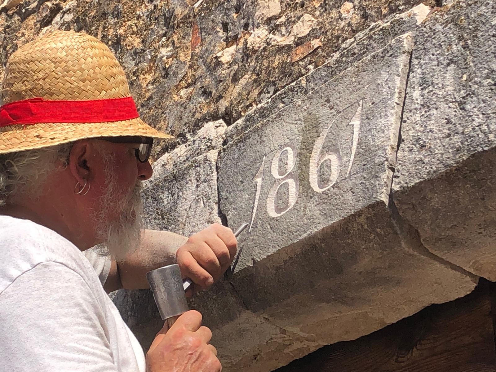 Agraiexo la feina feta per Joan Mateu, Mateuet, que sota un sol de justícia i una calor abrusadora va gravar el 1861 sobre la clau de volta de l’arc de la porta. I gràcies, també a tots els que vau participar en l’esdeveniment: Àngels, Sergi, Eli i Santiago: aguantant l’escala, fent fotografies i animant al picapedrer.