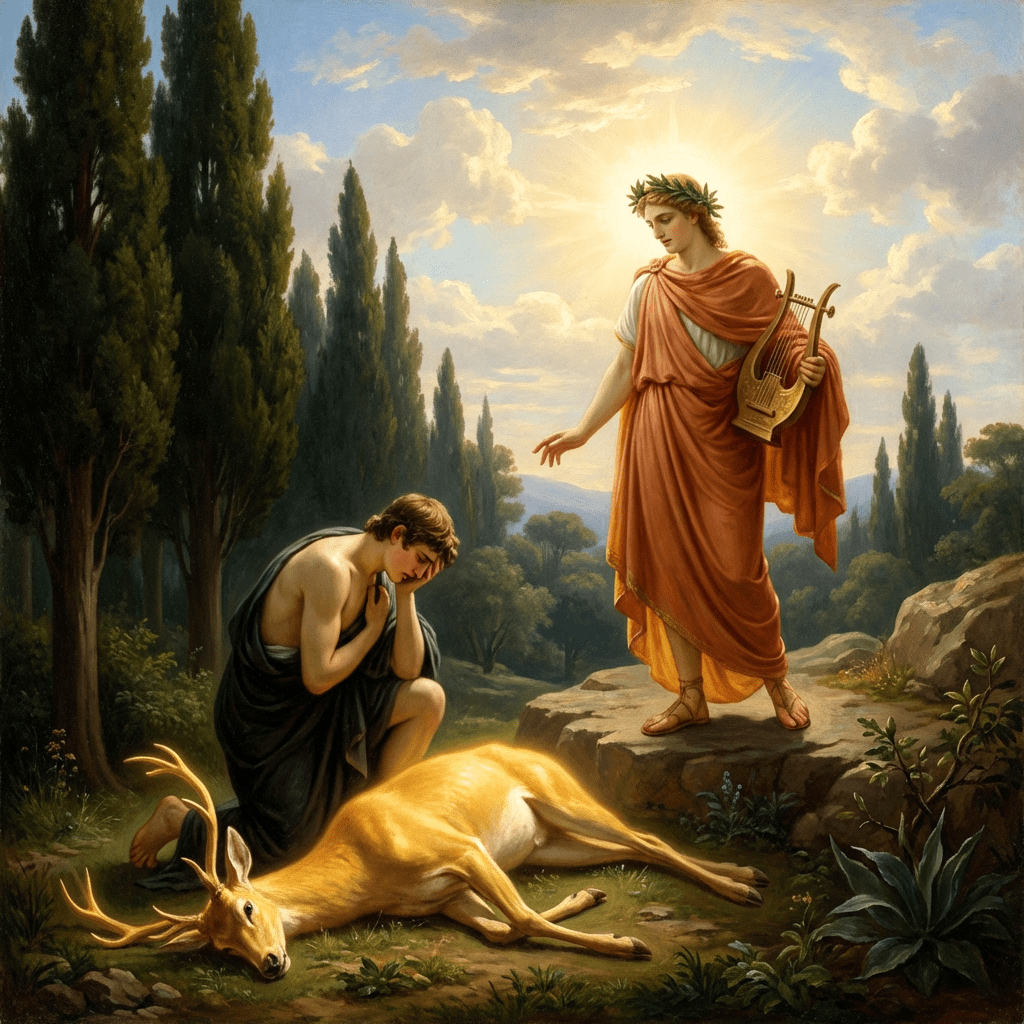 Tenia un cérvol domesticat amb les banyes d’or i garlandes de pedres precioses com a company predilecte, que l’acompanyava a tot arreu. Un dia, Apol·lo va regalar unes fletxes a Ciparís que, emocionat, les va voler provar. El cérvol dormia estirat a l’ombra i al disparar la fletxa Ciparís va matar-lo per equivocació. Ple de dolor va demanar als déus que l’ajudessin a plorar sempre la mort d’aquell bell cérvol. Apol·lo el va convertir en un xiprer, que simbolitza la tristesa, el dol i el dolor pels éssers estimats.