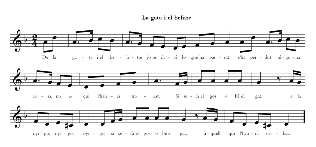 De la gata i el belitre jo us diré lo que ha passat: s’ha perdut alguna cosa, no sé qui l’haurà trobat. Si serà el gos o bé el gat, a la nyigo, nyigo, nyigo, nyigo, si serà el gos o bé el gat aquell qui l’haurà trobat.